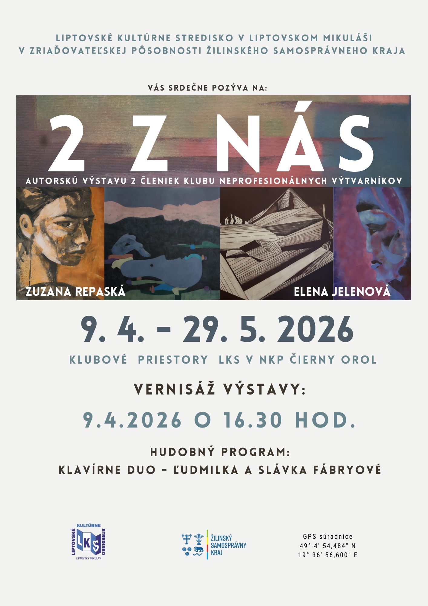 Vo štvrtok dňa 9.4.2026 sa v klubových priestoroch Liptovského kultúrneho strediska v NKP Čierny orol, konala vernisáž výstavy 2 Z NÁS.V rámci tohto zaujímavého formátu Liptovské kultúrne stredisko v spolupráci s Klubom neprofesionálnych výtvarníkov pri LKS a lektorom Mgr. art. Róbertom Močiliakom každoročne odprezentuje tvorbu 2 členov / členiek klubu.