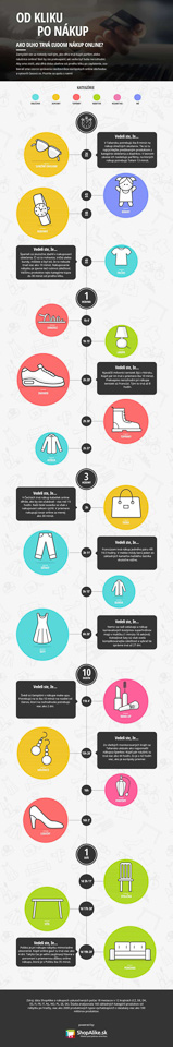 Pre lepšiu vizualizáciu zákazníckeho správania sme pre vás pripravili časovú os mapujúcu nákup bežných produktov priemerného Európana. Nákup väčšiny produktov nezaberie viac ako 48 hodín. Infografika znázorňuje časový úsek od prvého kliku na produkt až po jeho zaplatenie. Produkty sú rozdelené do kategórií podľa segmentu, ktorý reprezentujú - oblečenie, doplnky, topánky, nábytok, kozmetika, iné.