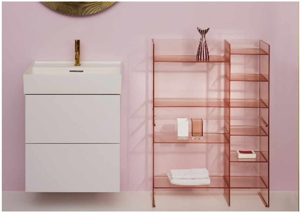 Minimalistická kolekcia Kartell ponúka nielen umývadlové a závesné skrinky, ale aj regály, v ktorých budú kúpeľňové potreby vždy na dosah. Vyrobené sú z odolného plastu, ktorý perfektne odolá náročnému kúpeľňovému prostrediu. Zároveň sa ľahko udržujú čisté. Zakúpiť ich možno v najrôznejších farbách, napríklad v púdrovo ružovej, smoky grey, ale aj v transparentnej variante.