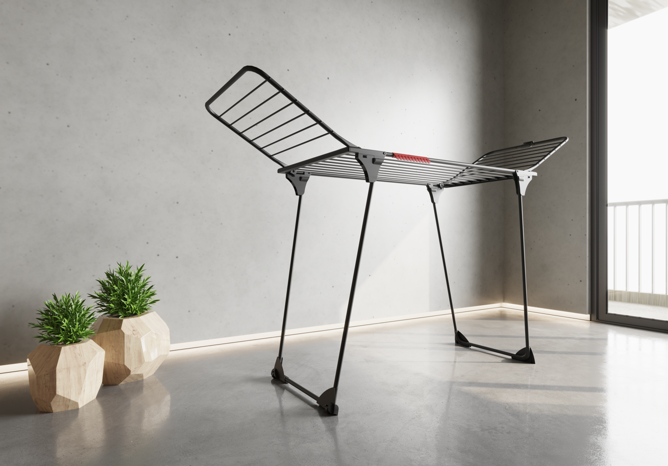 Vileda King sušiak prichádza so štýlovým prevedením v matne čiernej farbe s červenými doplnkami. Ponúka 20 metrov sušiacej plochy a vďaka silným hliníkovým drôtom zabráni pokrčeniu bielizne, čo urýchli následné žehlenie. Naviac má aj dodatočný držiak pre malé odevy, ktorý vám poskytne jednoduché a rýchle zavesenie ponožiek či spodnej bielizne bez potreby štipcov. Kolieska zaisťujú jednoduchý presun sušiaku z miesta na miesto. Nikam vám však neujde, keďže je vďaka pevným nohám robustný a stabilný.