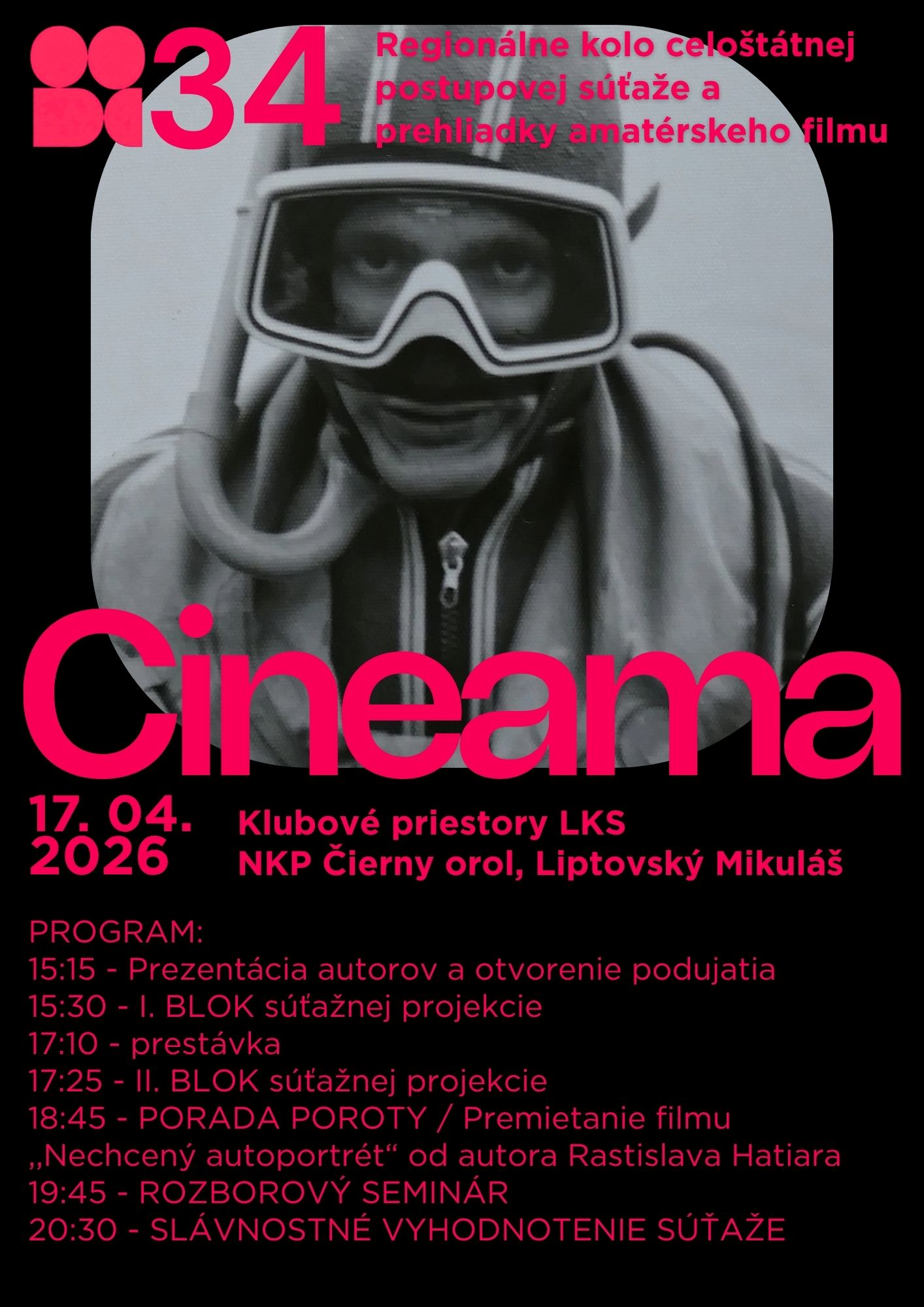 Srdečne Vás pozývame na 34. ročník regionálneho kola celoštátnej postupovej súťaže a prehliadky amatérskeho filmu CINEAMA 2026, ktorý sa uskutoční: