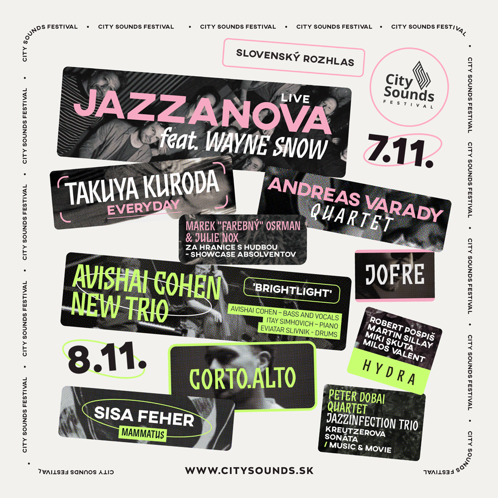 Hviezdami tohtoročného festivalu budú Avishai Cohen, Jazzanova Live s Waynom Snowom, Takuya Kuroda či corto.alto. V predaji zostáva už len posledná tretina vstupeniek, festival je teda z dvoch tretín vypredaný. Kompletné informácie o festivale na www.citysounds.sk.