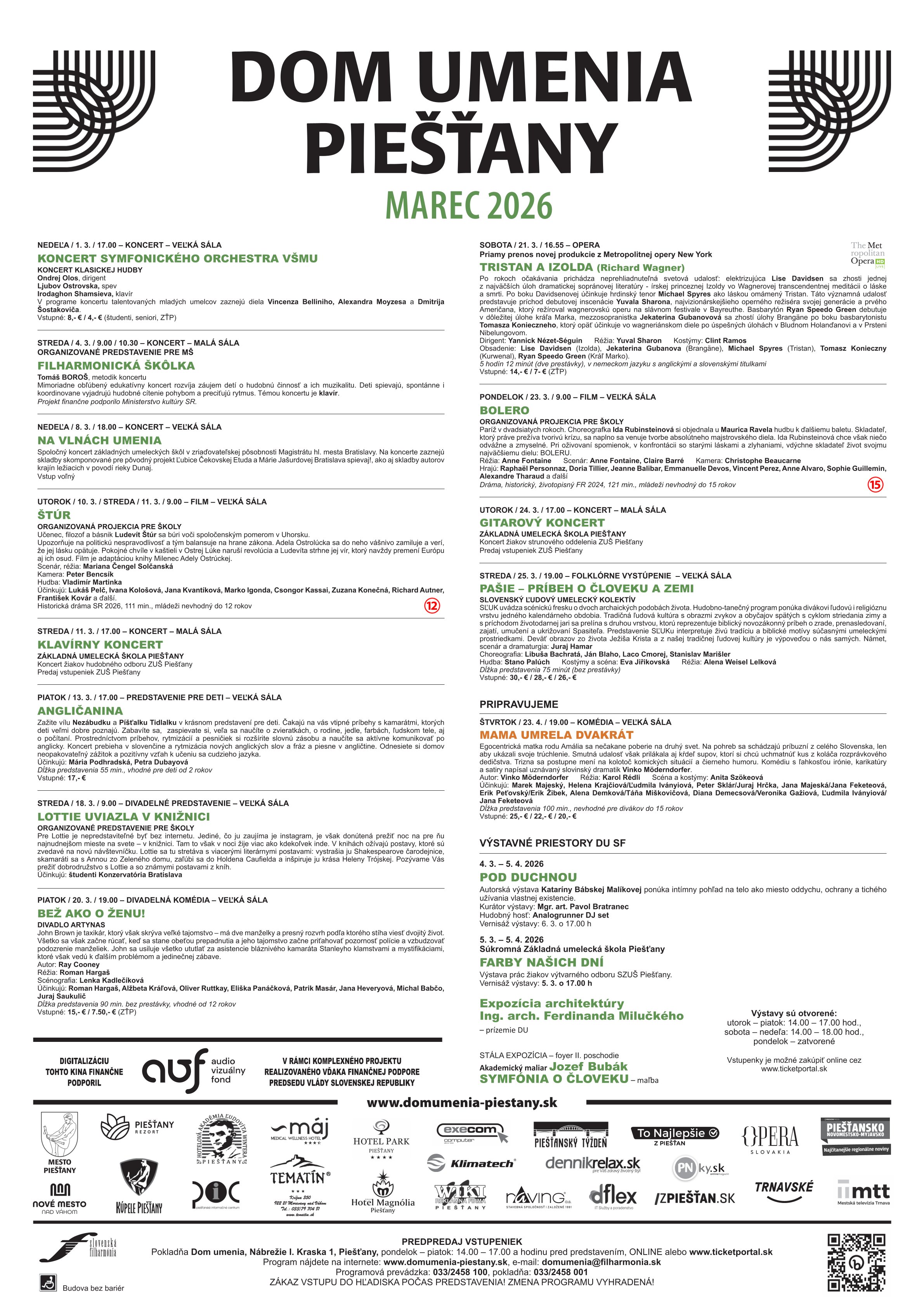 Program nájdete na internete: www.domumenia-piestany.sk, e-mail: domumenia@filharmonia.sk