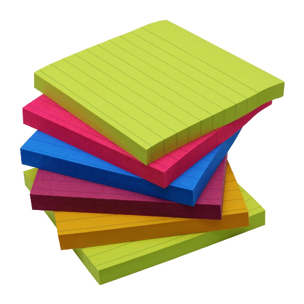 Samolepiace štítky v dúhových farbách Post-it® 675 Rainbow XL: silne lepiace, farebné, linkované bločky vo farbách 2x citrus, 1x fuchsia, 1x oceľovo modrá, 1x neon žltá, 1x purpurová. Veľkosť 101 x 101 mm, 90 štítkov v bločku.