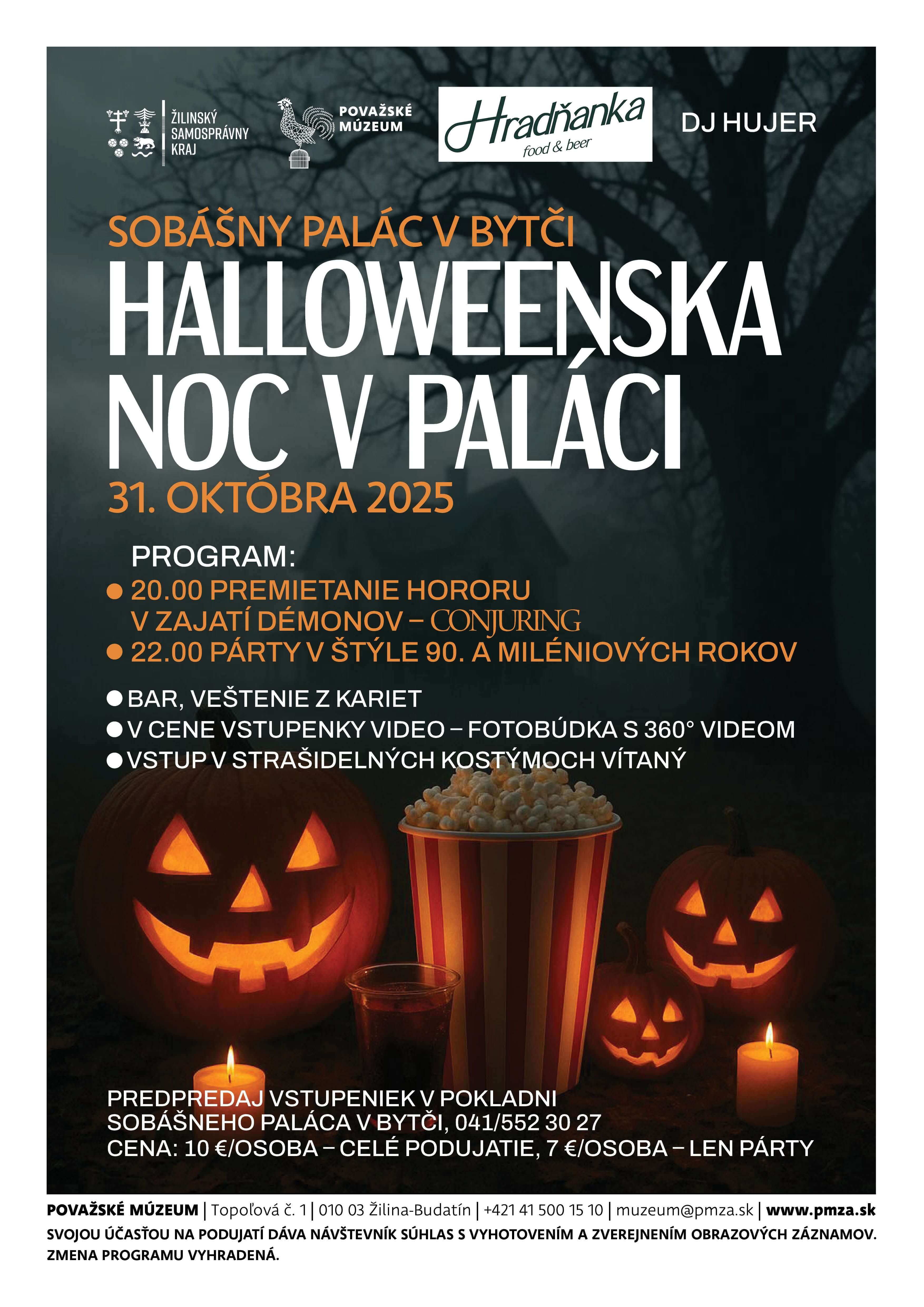 „Návštevníci sa môžu tešiť na kino premietanie so všetkým, čo k tomu patrí – popcorn, drinky i strašidelnú kulisu. Po premietaní bude nasledovať after party v štýle dodnes obľúbených 90. a miléniových rokov. V sále bude k dispozícii party kútik 360 s množstvom rekvizít. Vzhľadom na veľký úspech sa k nám vracia aj veštica Mama Fortuna. Kruh sa uzavrie na bare, kde sa budú miešať halloweenske drinky. Privítame všetky originálne masky a kostýmy,“ pozýva kultúrna manažérka Vladimíra Horvátová zo Sobášneho paláca v Bytči.