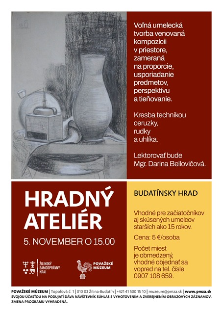 „Budeme sa venovať kresbe kompozície v priestore, pri ktorej sa zameriame na jej proporcie a usporiadanie predmetov, perspektívu a tieňovanie. Kresba, ktorá zahŕňa techniku ceruzky, rudky a uhlíka, patrí k najstarším technikám a k základným zručnostiam umelca, ktorý pomocou nej dokáže vyjadriť nielen presnosť videného predmetu, ale aj vlastné pocity a myšlienky,“ približuje Darina Bellovičová z Považského múzea.