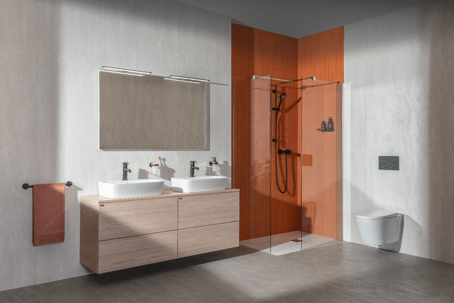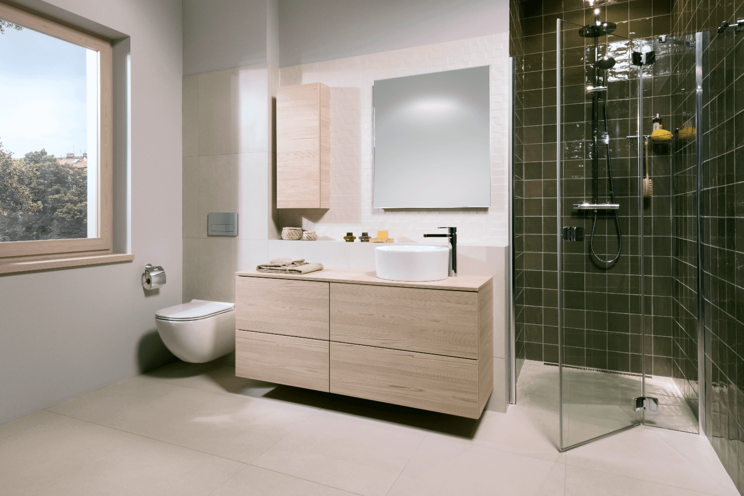 - Nábytok v drevodekore a tlmené odtiene prispievajú k harmonickej atmosfére celej kúpeľne. Skrinky zo série Cubito značky JIKA boli navrhnuté v minimalistickom nadčasovom štýle bez rušivých prvkov.