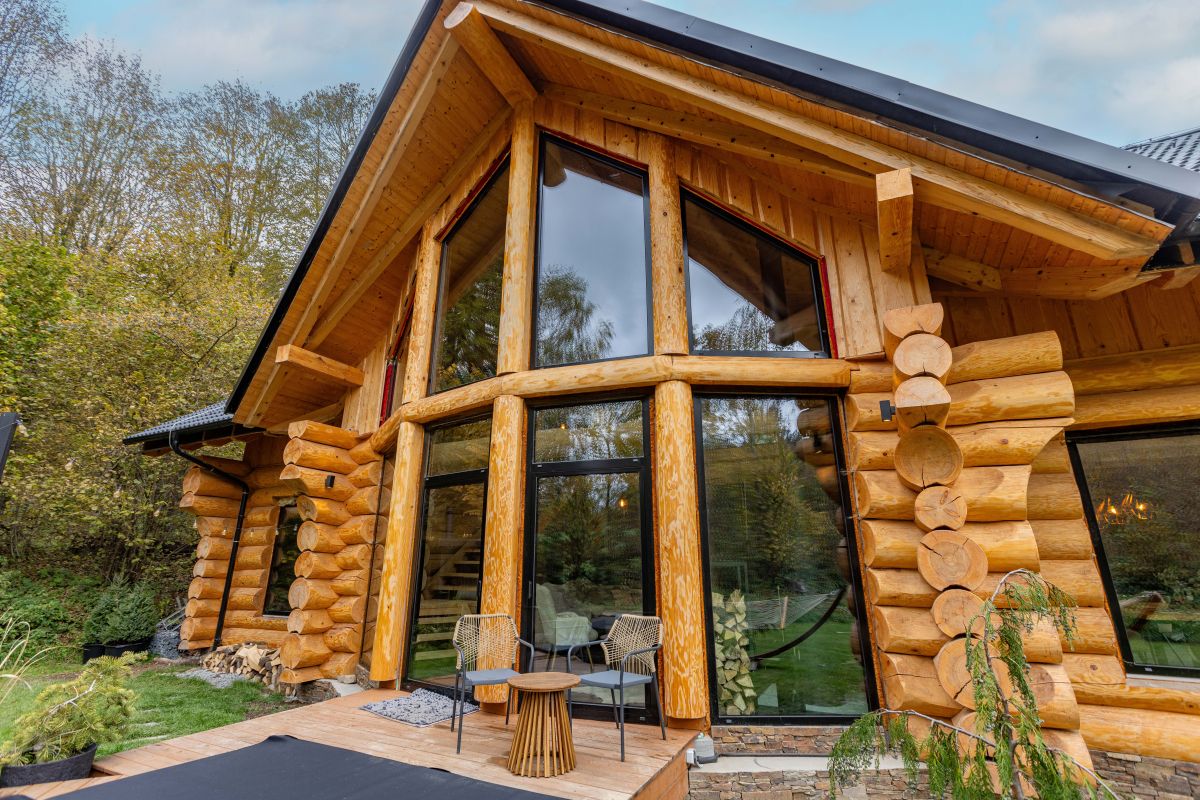 Stavba je založená konzervatívne na betónových pásoch a soklovom murive z tvárnic strateného debnenia s tepelnou izoláciou. „Štandardne boli použité dosky z extrudovaného polystyrénu, ktorý je tvrdý, veľmi dobre izoluje a je nenasiakavý. Dá sa naň následne pridať aj kamenný obklad, ako tomu bolo v tomto prípade,“ opisuje architekt. Samotná zrubová konštrukcia je z beskydskej jedle s priemerom 40 centimetrov. Drevené steny spĺňajú normy pre tepelnoizolačné vlastnosti, takže ich už nebolo potrebné dodatočne zatepľovať. „Jedľu sme zvolili pre krajšiu kresbu dreva. Z vnútornej strany je drevo iba vybrúsené, zostáva mu krása surovosti, zvonku sa guľatina obrúsi a natrie, čo je potrebné približne každých 10 až 12 rokov zopakovať,“ uvádza majiteľka a dodáva: „Celý zrub bol najskôr postavený v mieste jeho výroby, potom rozobraný, naložený a znovu postavený na pripravených základoch domu.“ Montáž strechy zabezpečilo Klempířství Roman Divina. Ako strešná krytina bola zvolená pálená škridla Bramac.