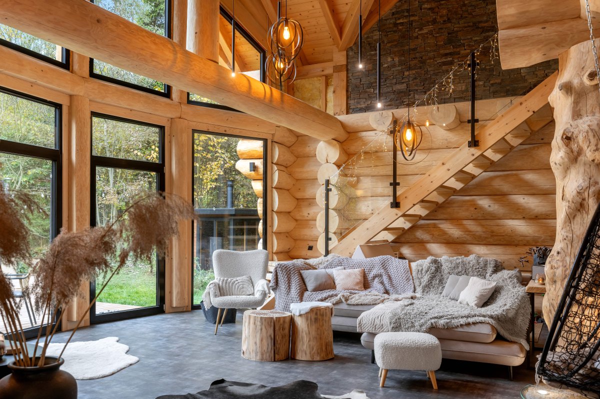Dom má tvar obdĺžnika a interiér zrubu je navrhnutý ako prízemný so vstavaným podkrovím a veľkolepou presklenou galériou. Na prízemí sa nachádza priestranná kuchyňa s jedálenským kútom. Kuchynskú linku v antracitovej farbe, ktorá je plne vybavená modernými spotrebičmi, dopĺňa jedálenský stôl, pri ktorom si majitelia môžu vychutnať nádherný výhľad na okolitú krajinu. „Do jedálenskej časti, z ktorej je prístup na jednu z terás priliehajúcich k domu, zvolila majiteľka zdvižno-posuvný systém INCON ALUMINIUM PORTAL,“ hovorí architekt. Tento systém ponúka prakticky neobmedzené konštrukčné možnosti a elegantne prepája interiér s exteriérom. Ing. Ladislav Pavlovič, obchodný riaditeľ INCON, dopĺňa: „HS portál tvorí pevné a posuvné krídlo, ktoré sa pohybuje v podlahovej koľajnici rovnobežne popri pevnom krídle. Výstup na terasu je tak úplne bezbariérový, a to vďaka nulovému prahu s rozdielom výšok iba 5 mm.“ Ďalšie okenné prvky zrubu sú zvolené v rovnakom materiálovom aj farebnom prevedení. Majiteľka si vybrala hliníkové okná INCON ALUMINIUM COMFORT s izolačným trojsklom v čiernej farbe RAL 9005. „Hliníkové prevedenie si majiteľka zvolila preto, že ide o prakticky nezničiteľný materiál, ktorý vydrží desaťročia,“ uvádza Ing. Jiří Roubík.