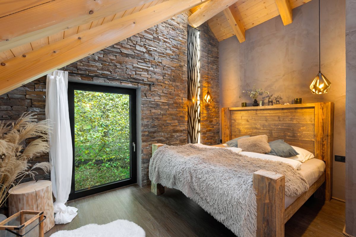 „Výberu obkladov som venovala veľa času a nakoniec som do celého priestoru domu zvolila bridlicu a jej inštaláciu sme realizovali sami,“ dopĺňa majiteľka. Dominantou celého priestoru je však presklený okenný štít, ktorý miestnosti dodáva jedinečný charakter. Na prvý pohľad zaujmú atypické šikmé okná. „Štít je otvorený z hornej aj spodnej časti, bez podlažia so stropným záklopom, a umožňuje úplne dych vyrážajúci výhľad,“ opisuje majiteľka a dodáva: „Je to jeden z mojich splnených snov. Presklenými, otvorenými štítmi som sa inšpirovala počas svojich ciest a vedela som, že presne toto raz chcem vo svojom dome zrealizovať.“
