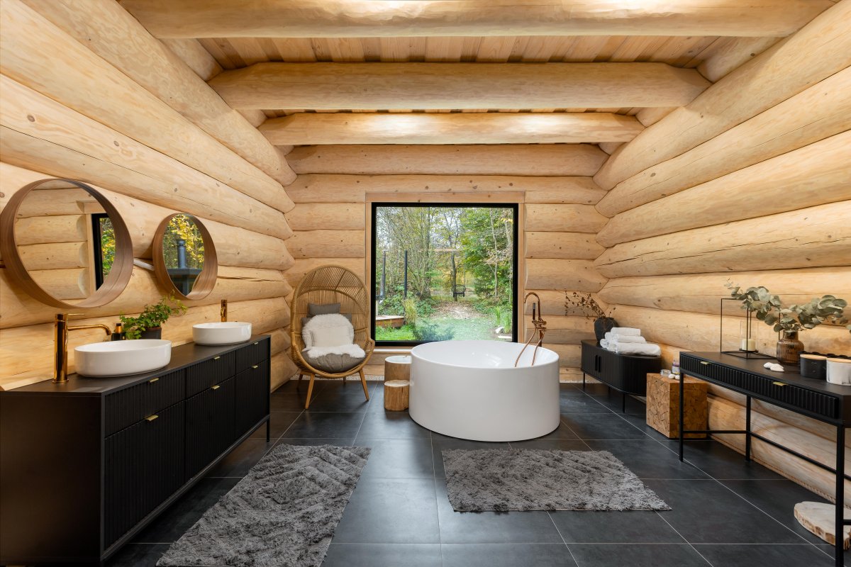 Ďalším výrazným prvkom miestnosti je masívny drevený dekoračný kmeň, majiteľkou nazývaný „big boy“, ktorý je v spodnej časti podsvietený. Na podlahu prízemia bol použitý vinyl v príjemnom šedočiernom dekore. Čierne akcenty sa opakujú aj na stropných svietidlách, ktoré boli zvolené v modernom závesnom dizajne s tienidlami v tvare prepletených kruhov a samostatných tubusov. Majiteľka v celom priestore domu následne siahla po doplnkoch a dekoráciách v zemitých farbách, ktoré spolu s osvetlením miestností vytvárajú jedinečnú atmosféru. Prízemie domu ponúka na využitie aj jednu z kúpeľní – veľkorysú miestnosť s dominantnou okrúhlou vaňou doplnenou voľne stojacou batériou. Priestor kúpeľne ponúka relaxačnú zónu, ktorá láka k nerušenému oddychu s výhľadom do záhrady.
