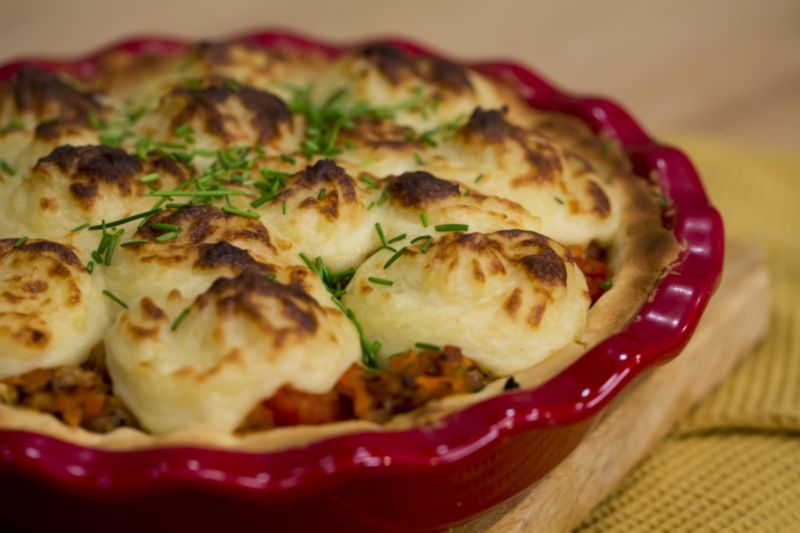 Zemiaky uvaríme do mäkka a spolu s maslom a vlažným mliekom vyšľaháme na jemné zemiakové pyré. Na masle orestujeme mrkvu s hráškom, ľahko zalejeme vodou alebo vínom a necháme chvíľku podusiť.