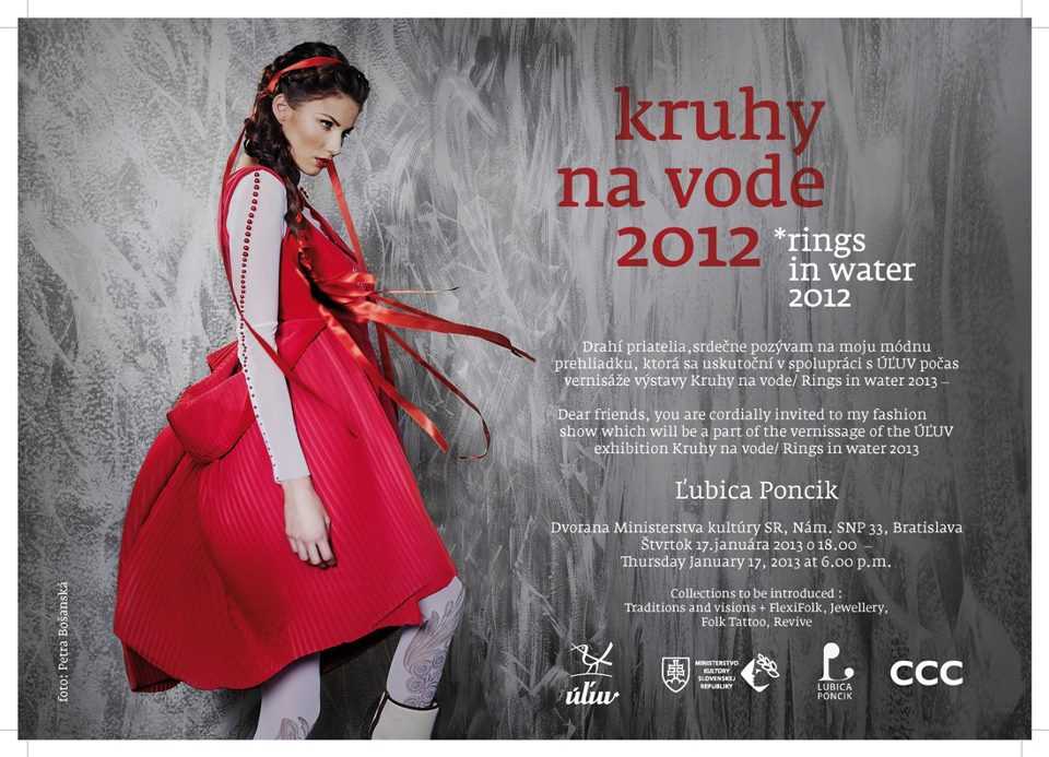 Súčasťou slávnostnej vernisáže spojenej s ocenením víťazných prác Kruhy na vode 2012, ktorá sa bude konať 17. januára o 18. 00 hod. v Dvorane Ministerstva kultúry SR, bude aj módna prehliadka odevnej dizajnérky Ľubice Poncik. V nej budete mať možnosť zhliadnuť modely z jej kolekcií Tradície a vízie, Flexi Folk, Folk tattoo a očakávanú najnovšiu kolekciu, ktorú predstaví pod názvom REVIVE. Čerešničkou na torte budú jedinečné šperky kolekcie luby_hany vytvorené v spolupráci so šperkárkou Hankou Horbanovou - Kašičkovou. Máme sa na čo tešiť!