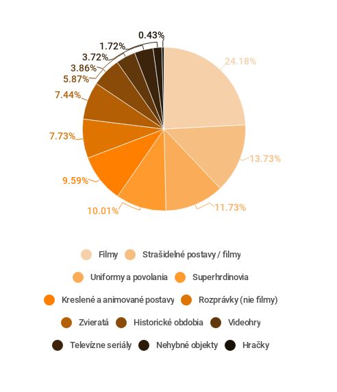 Posledných pár rokov ukazuje, ako hľadané halloweenske kostýmy súvisia s filmovým priemyslom. K najpopulárnejším sa dostali najmä postavy z veľkých trhákov. Druhou najobľúbenejšou tématickou skupinou sú klasické strašidelné postavy ako duchovia, čarodejnice alebo postavy z klasických hororov. Tesne za nimi sa na tretej priečke umiestnili kostýmy rôznych povolaní a uniforiem - požiarnici, policajti alebo roztlieskavačky, to sú nesmrteľné klasiky.