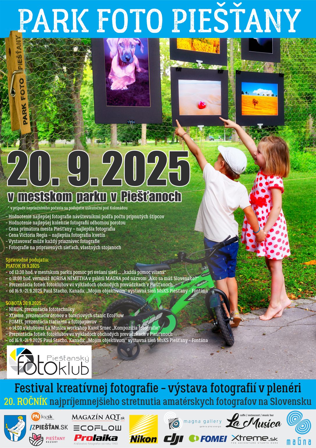 Už po 20. krát sa v piešťanskom Mestskom parku uskutoční najväčšia slovenská výstava fotografií pod holým nebom: PARKFOTO PIEŠŤANY 2025. Súťažnú výstavu fotografií, ako festival kreatívnej fotografie s podporou reklamných partnerov organizuje občianske združenie Piešťanský fotoklub. PARKFOTO sa stalo súčasťou každoročného neoficiálneho ukončenia letnej sezóny v Piešťanoch. Tento rok to bude 20. septembra.