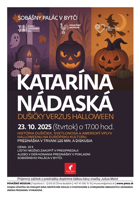 V Sobášnom paláci v Bytči sa bude vo štvrtok 23. októbra o 17.00 konať prednáška pod názvom Dušičky verzus Halloween. Povedie ju známa etnologička Katarína Nádaská, ktorá priblíži zvyky, tradície, vplyvy a fenomény našich predkov vo vzťahu ponímania posmrtného života a večnosti.
