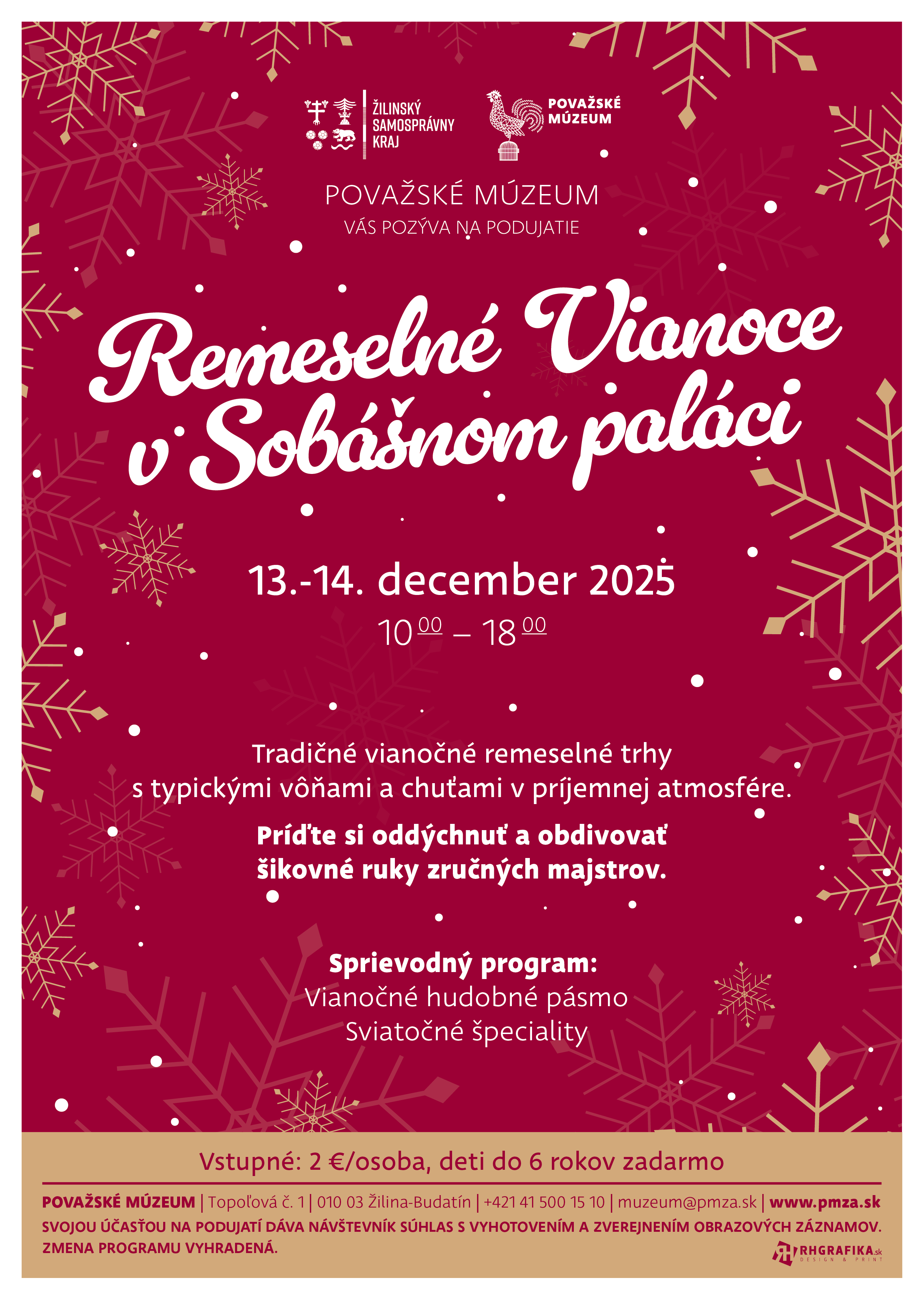 Strávte príjemný predvianočný čas v krásnych priestoroch Sobášneho paláca v Bytči. Počas víkendu 13. a 14. decembra v čase od 10.00 do 18.00 sa uskutoční druhý ročník podujatia Remeselné Vianoce. Považské múzeum sa po minuloročnom úspechu a pozitívnej odozve rozhodlo podujatie zopakovať a rozšíriť.