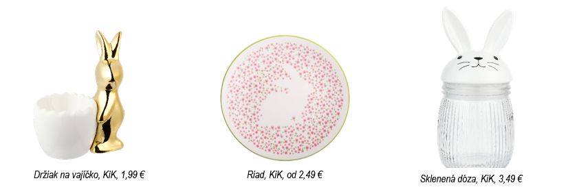 Tanier so zaujímavým motívom krásne doplní miska v rovnakom duchu aj držiak na vajíčka so zlatým detailom zajaca. V KiK nájdete aj sklenenú dózu na sušienky, ktorá svojím dizajnom zapadne ku každému štýlu. Spolu tak vytvoríte harmonický základ stolovania, ktorý pôsobí sviežo a premyslene.