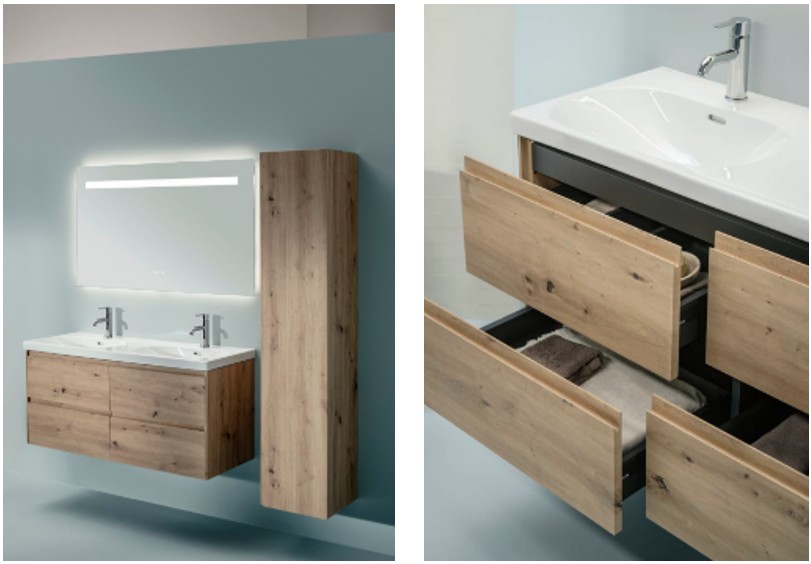 Nadčasový nábytok LANI v prevedení divoký dub vnesie do interiéru hrejivosť a navodí pocit domova. O štedrý úložný priestor umývadlovej skrinky sa starajú 2 až 4 zásuvky so spomaleným zatváraním, integrovanými úchytkami a vo vnútri sú navyše doplnené o praktické organizéry. Závesné skrinky obsahujú sklenené poličky a dvierka s tichým dovieraním. Okrem prevedenia v divokom dube sú dostupné aj v bielej alebo sivej traffic.